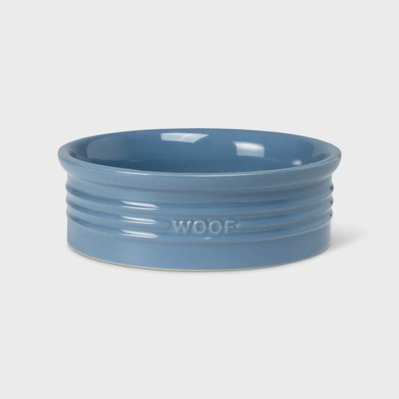 A pet bowl designed to complement modern home dcor! This small sculpted dog bowl features glossy french blue glaze and raised art.