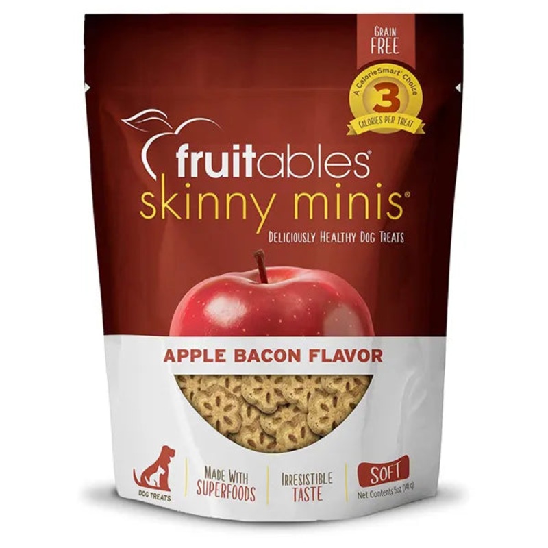 Fruitables Skinny Minismake delicious, chewy, bite-sized treats for big and small dogs and work great for a little training reward. TheseSkinny Minisare made with real apple, bacon, sweet potatoes, honey, and chickpeas to provide essential nutrients, inclu