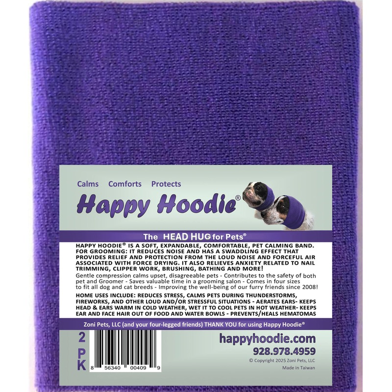 Happy Hoodie is a soft, expandable, fabric calming band. Its gentle compression reduces noise and has a swaddling effect that relieves anxiety and calms dogs and cats during stressful situations in the home, grooming salon, and Vets. It is best known for keeping dogs calm during the force drying process. Common reasons for Grooming Salon use: Force drying, Bathing, Clipper work, Trimming nails, Brushing/dematting, Touchy on feet, Nervous about being there, Aggressiveness. Grooming benefits include: *Swaddling effect and noise reduction calms upset, disagreeable pets *Contributes to the safety of both pet and groomer or pet owner *Saves valuable time in the grooming salon *Speeds up drying time by wicking water from the ears and face *Helps to protect pets hearing *Comes in 4 sizes to accommodate all dog and cat sizes. HOME USES- CALMS PETS DURING STRESSFUL EVENTS, such as: Thunder, Fireworks, Gunfire, Vacuuming, Noisy environment, Toenail trimming, Brushing, Bathing, Blow drying, Paw handling, Car rides, Visitors, Vet exams, Keeps head warm, Aerates ears, Prevents and aids in healing Hematomas. Happy Hoodie has gentle compression that creates a swaddling effect and reduces noise to naturally calm upset pets. Keeps pets calm during Thunderstorms, Fireworks, Grooming (most importantly during Force Drying), Vet exams, Car Rides, and any other potentially stressful/noisy situation. Can prevent/heal hematomas