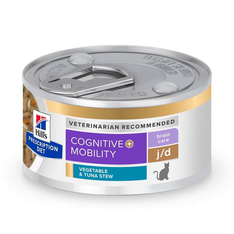 ProductHills Prescription Diet Brain Care + j/d Joint Care Tuna & Vegetable Stew Wet Cat FoodProduct InformationHill's Prescription Diet Brain Care + j/d Cat Food offers clinical nutrition specially formulated to support cognitive function and mobility in