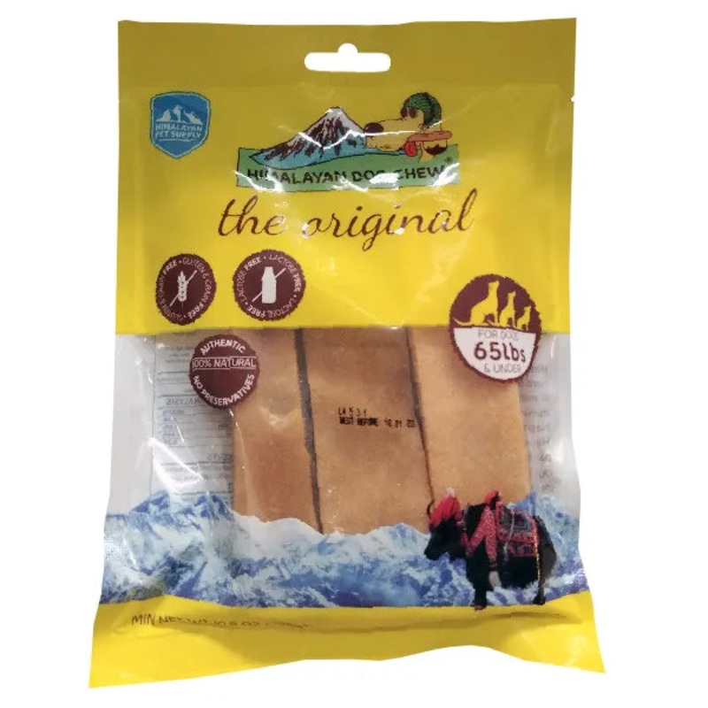 TheHimalayan Dog Chew, Large Dog, 326 g (11.5 oz)is derived from an ancient recipe of the Himalayas and Nepal.This chew pack includes 3 chews specifically cut to size fordogs under 29.5 kg (65 lb.).The chew is actually an authentic cheese eaten by the peop