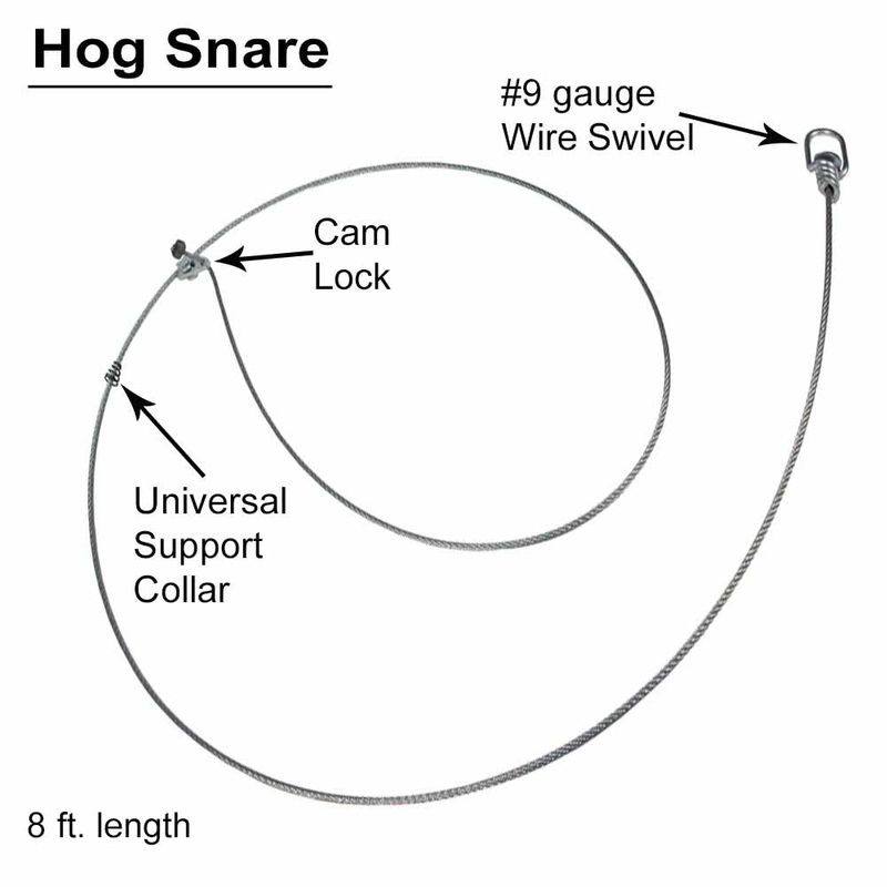 Hog/Wolf Snare: This is a heavy-duty hog/wolf snare comprised of six feet of 7 x 7 (7 strands/7 bundles) 1/8" galvanized aircraft cable with a heavy-duty #9 gauge wire swivel used for anchoring. This snare is built with a positive locking camlock. Availabl