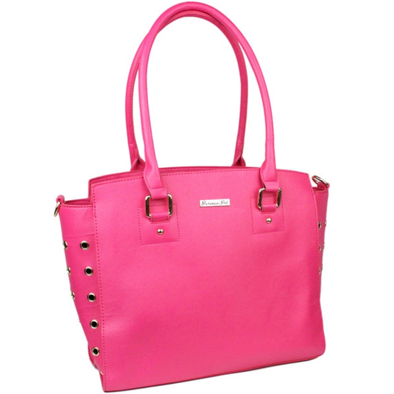 - This chic dog carrying bag features contrasting golden accents on vibrant pink faux leather lining.