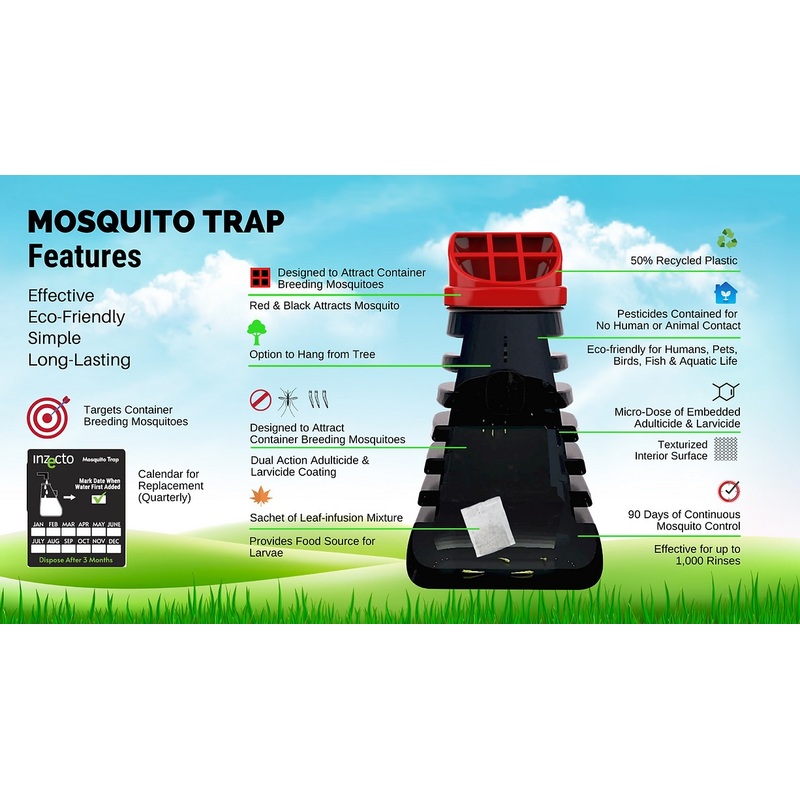 The INZECTO Patented One-of-a-Kind Application utilizes a micro-dose of pesticides embedded into the surface of theINZECTO Mosquito Traps. Designed for Mosquito Prevention, utilize at the beginning of the season to prevent the spread of dangerous diseases