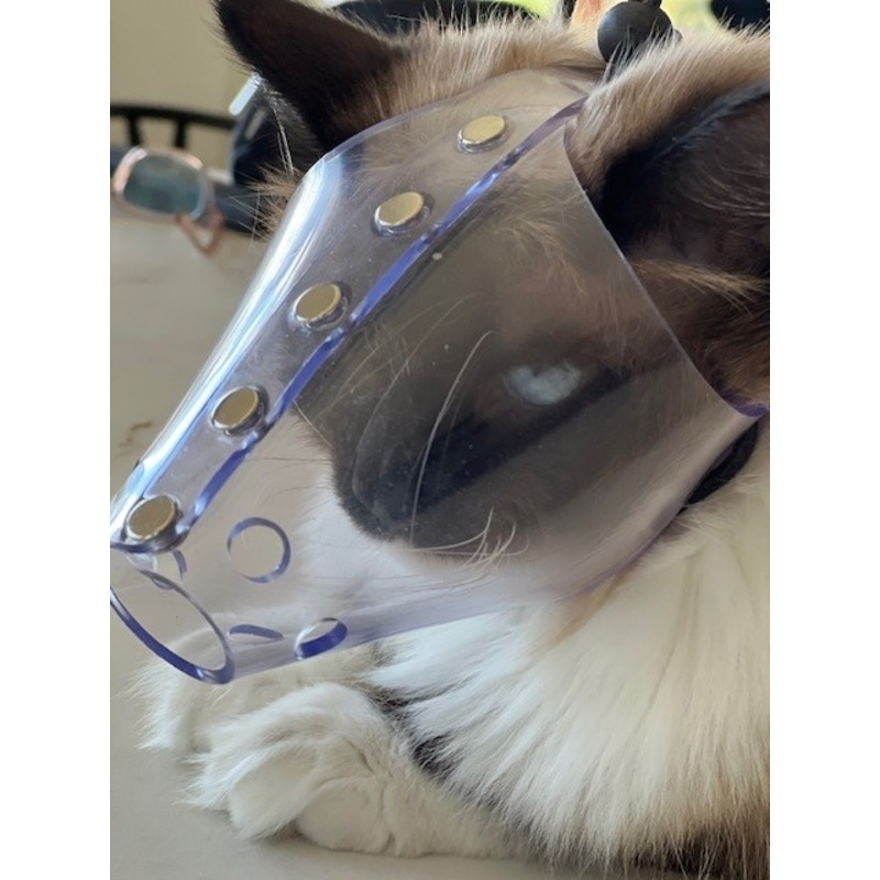 JAFCO Cat Muzzles are renowned for their lightweight, durability and ease of cleaning. These clear vinyl muzzles are available in two sizes large (size 3) and small (size 2). Slip the muzzle over the cat’s face with cord pulled over behind the cat’s ears, then tighten the cord lock to hold the muzzle in place. Frankie our 11lb Ragdoll is modelling the large muzzle, she could have easily fitted the small size. The large size is 4″ long and the small size is 2.5″ long.