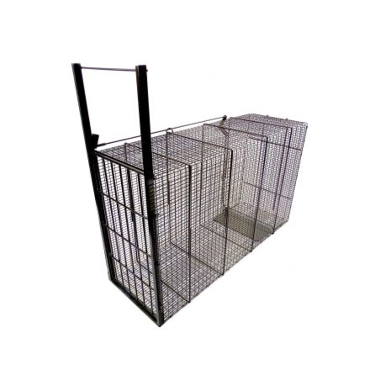 It features a guillotine style trap door that is triggered when the Javelina enters the trap and steps on the trip pan. The trap frame is built from x 1 14 gauge mesh and reinforced with steel rods wrapped around and welded to the frame. The guillotine door is built from 3/8 steel rod and designed to withstand the most ferocious Javelina head butts.