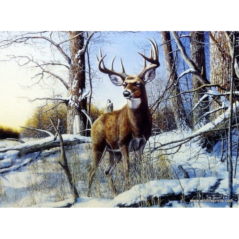 A big whitetail deer buck standson alert in a snowy wooded area. The hunters just missed him in Jim Hansel's After the Season.Image size 16 x 12