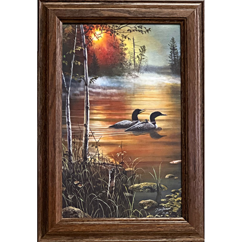 The Loon Family is quietly gliding across the lake toward the cabin in the flowersFramed Size 10" x 14.5"