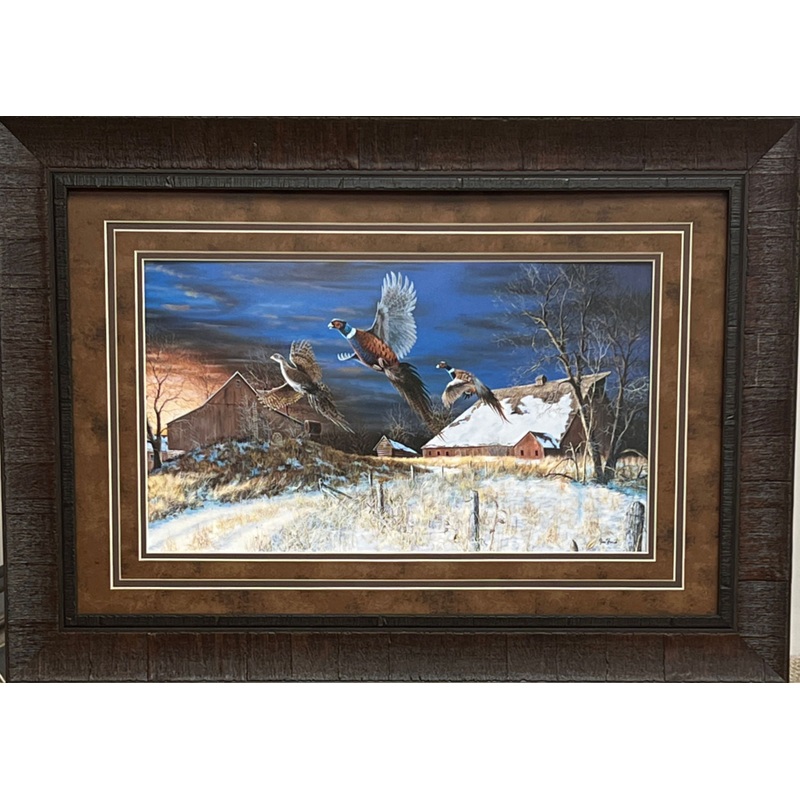 Framed Size 27.5"W x 19.5"HA picturesque snowy field is home to a group of majestic pheasants, with the charming old farmstead nestled in the background.