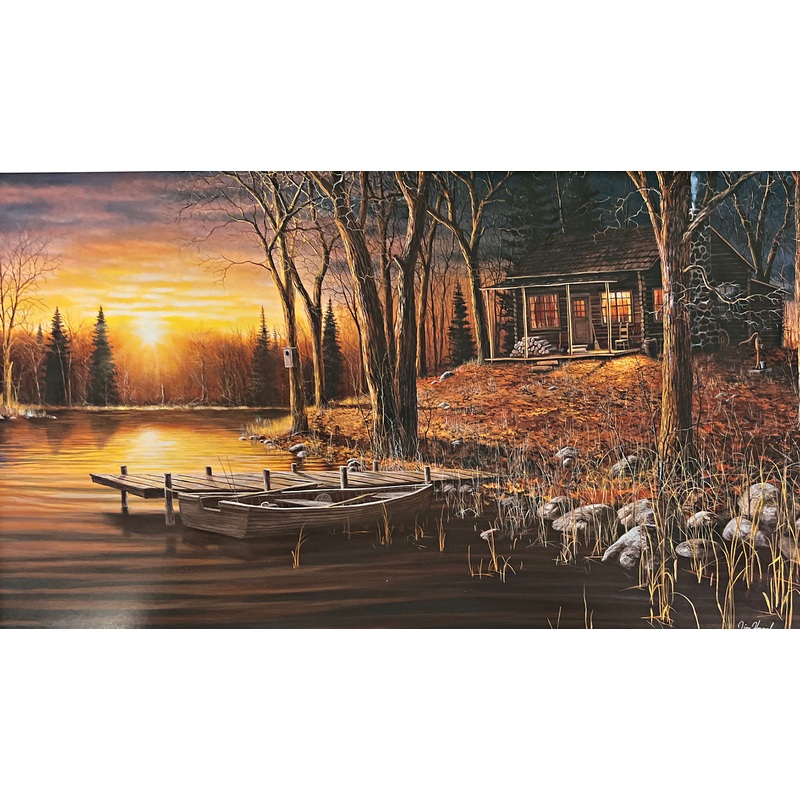 Aprimitivelog cabin is the perfect getaway, complete with a simple rowboat tied up to an old wooden dock.Simple Pleasures comes as an open edition print and is available in three different size options.