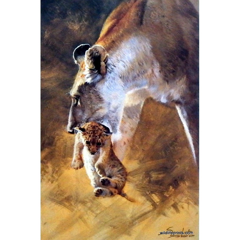 ME TO GO by wildlife artist John Seerey-Lester depicts a female lion moving her cub to safer ground. Lionesses will keep their cubs hidden away from the rest of the pride until they are about 6 weeks old. The lionesses of the pride will all share in the re