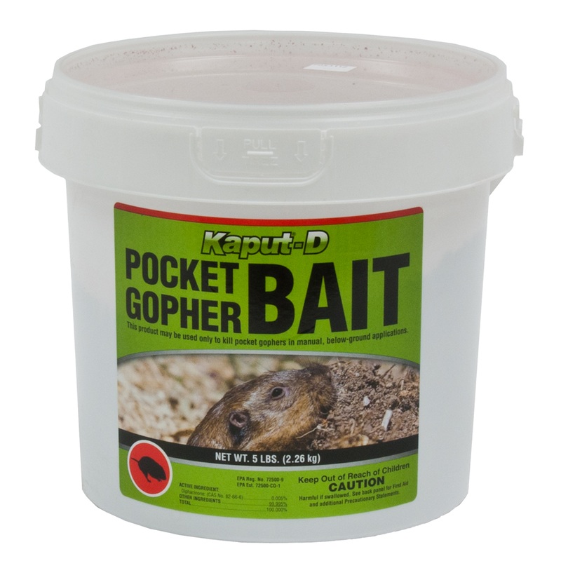 Kaput-D Pocket Gopher Baitis a red grain containing the active ingredient Diphacinone. It effectively kills gophers on lawns, golf courses, rangeland, and other non-crop areas. It can be easily applied with the Gopher Pro tool and usually kills within one week. Unlike products containing strychnine or zinc phosphide, Kaput-D has an antidote (Vitamin K1) as well.