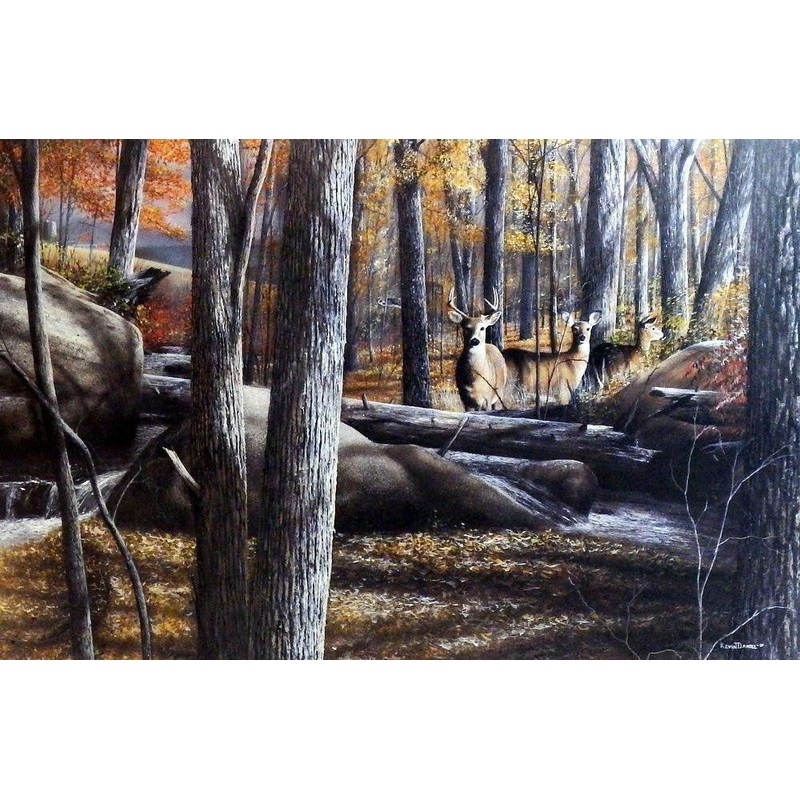 A Buck and two does are intently watching what is going on in front of them something has drawn their attention.Image Size 16"W x 12"H