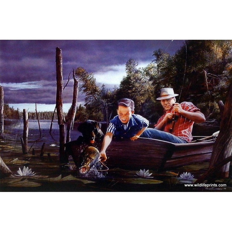 A Dad and his son share a special moment fishing as they seem to have caught "the big one."Image Size 23 x 14.5 Plus Border
