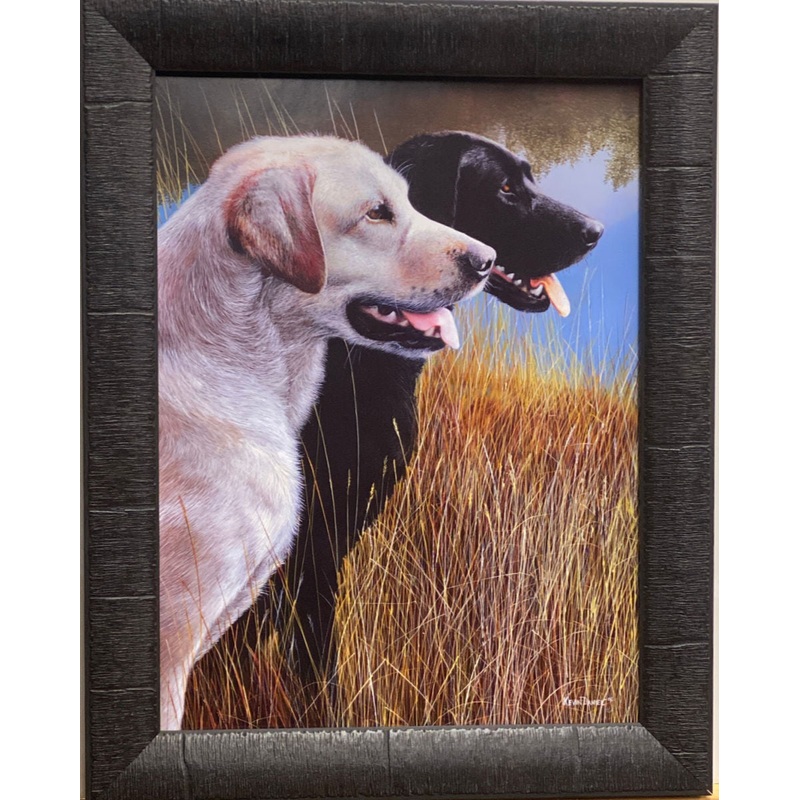 These two labs wait patiently by the lake to retrieve the hunted.Print is framed and hand textured without glass to give it the look and feel of a canvasFramed Size 15 x 19