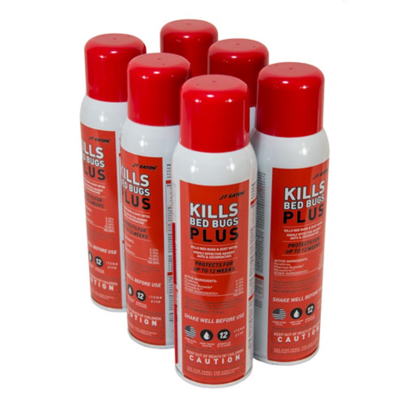 Kills Bed Bugs PLUS by J.T. Eaton is a water based Permethrin and Pyrethrin Aerosol Spray with 12 weeks of residual protection. Use on mattress and box springs, carpets, furniture and more to kill bed bugs, dust mites, ants and cockroaches.Packed 6- 17.5 o