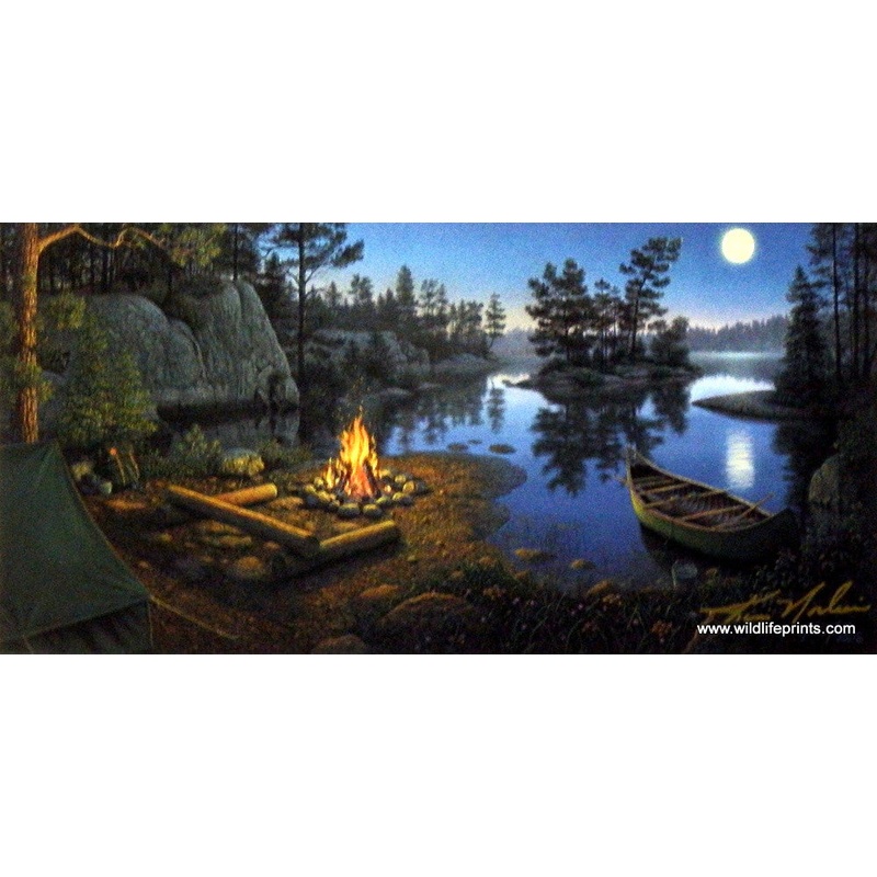 A camp site, in the back of the bay, lies seemingly quiet as the camp fire burns on a full moon's night in Kim Norlien's Moonlight BayImage size 32 x 16 plus border