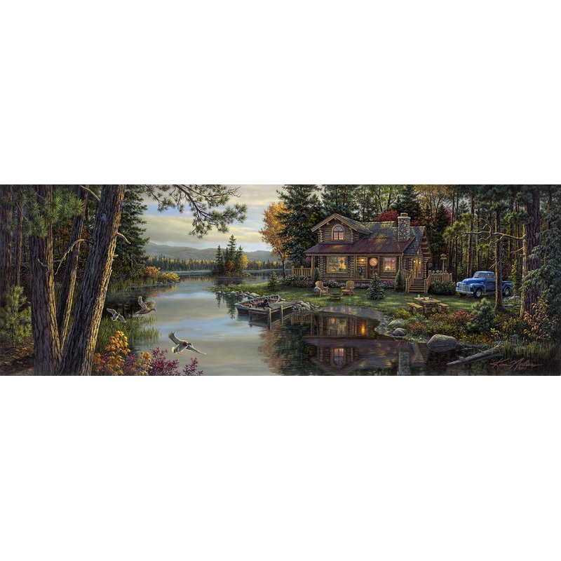 This great lodge is nestled in the woods with the river and its Mallards and other animals makes it the backdrop for a perfect day to relax with friends on the patio.Image size 36" x 12" 24" x 18" and 18" x 12"