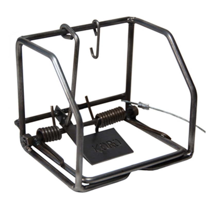 Koro #2 Large Rodent Double Spring,sometimes called Muskrat size, measures 5"W x 5"D x 4"H. This trap is excellent for gray squirrel sized animals. Very strong double spring model, can be tie-wrapped to a branch to use as a quasi-tunnel trap or in a baited