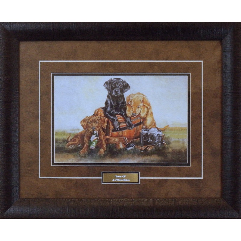 Lab Puppies playing with camera equipment looking ready to pose for a pictureFramed Size 21" x 17"
