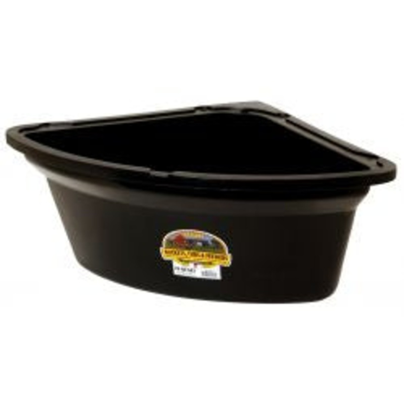 A corner feeder saves space and benefits from the added stability of the corner. High-impact polyethylene plastic stands up to tough farm use. Great for horses, sheep, goats, alpacas, and cattle. The Little Giant Corner Feeder can be mounted permanently on the top of two perpendicular rails with four lag screws (not included). For a feeder that can be easily removed for filling and cleaning, use the Little Giant Feeder Mounting Ring (Item No. CF1, sold separately); the Mounting Ring attaches permanently to the rail, allowing the feeder to be dropped in. This feeder can be used with the Little Giant Feed Saver Ring (Item No. CF2, sold separately). Available in several colors. Measures 25.5 inch long by 19.5 inch wide by 9.75 inch high. Holds 26 quarts (6.5 gallons).