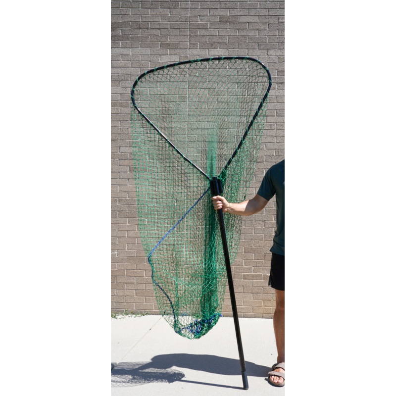 This is our largest net and features an all black anodized aluminum hoop and telescoping handles. When fully extended from the top of the net to the hand grip it is 10' long. The octagon handle guarantees perfect alignment of the push button every time you