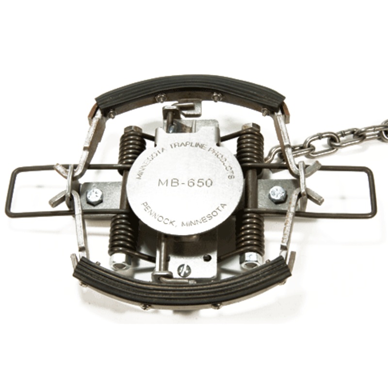 The MB-650-OS with J.C. Conner Rubber Pad kits installed. A top quality combination. This trap has a 1/2" jaw face, 6 7/8" outside jawspread and a 5 7/8" inside jawspread. SINGLE TRAPBrand:Minnesota Trapline ProductsTarget Pests:Coyote, Bobcat