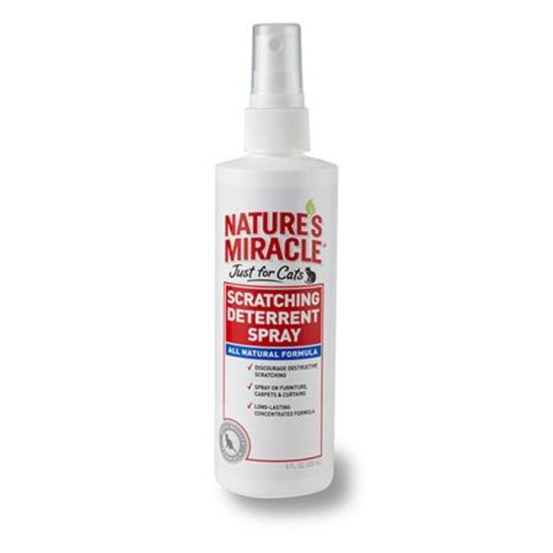 - Apply Nature’s Miracle Scratching Deterrent Spray to area or object where cat frequently scratches.