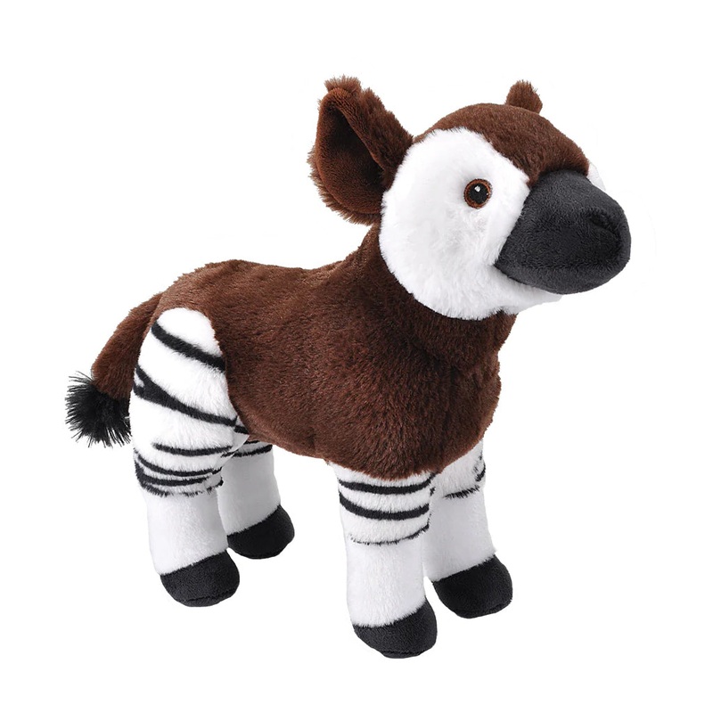 The okapi (pronounced oh-COP-ee) is a beautiful and unusual animal. With its white-and-black striped hindquarters and front legs, is it related to zebras? No! Take a look at an okapis head, and youll notice a resemblance to giraffes. The okapi is the only living relative of the giraffe. This beautiful okapi stuffy stands at about 9 inches tall and is made from recycled water bottles – a purchase you can feel good about too!