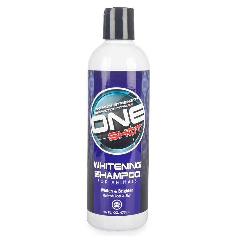 One Shot Whitening ShampooDirty jobs done right! Whiten & brighten any color coat! One shot whitening shampoo deep cleans and brightens coats, manes and tails. Restores your animal's hair to its natural color and vibrancy while keeping it soft and manageab