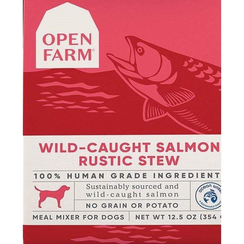 Our Wild-Caught Salmon Rustic Stews can be fed as topper over Open Farm dry food.