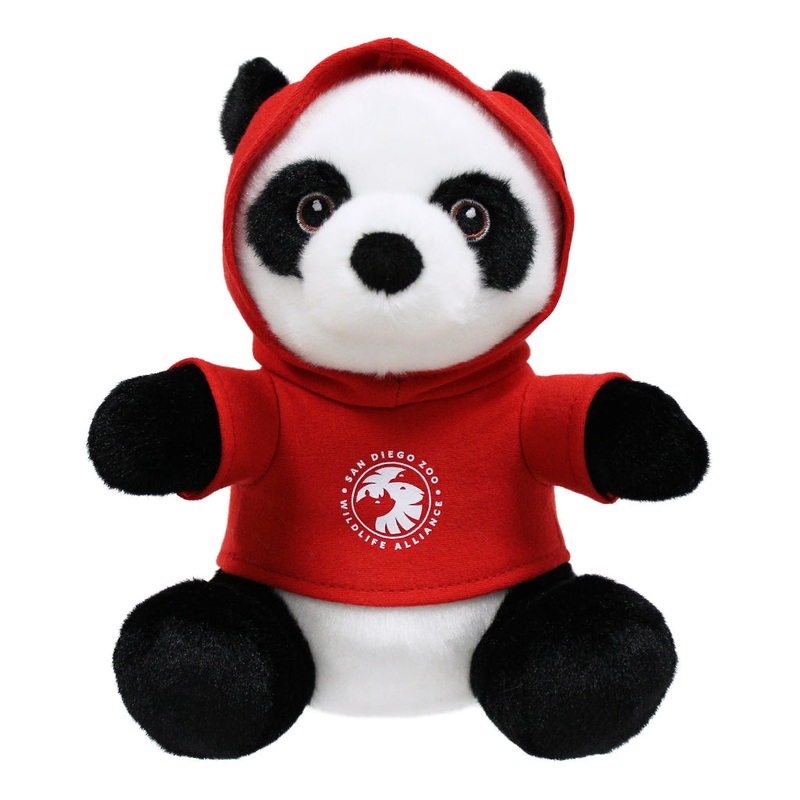 This exclusive black and white bundle of cuteness is sporting its very own San Diego Zoo hooded tee! Our logo is screened in white on a red short-sleeved hooded tee. Panda plush measures approximately 8 inches tall.FEATURESAn exclusive black-and-white bund