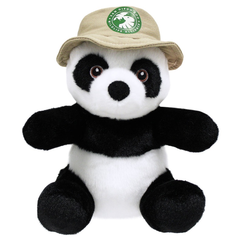 This exclusive black and white bundle of cuteness is sporting its very own San Diego Zoo bucket hat! Our logo is screened in green and white onto a little khaki bucket hat. Panda plush measures approximately 8 inches tall.