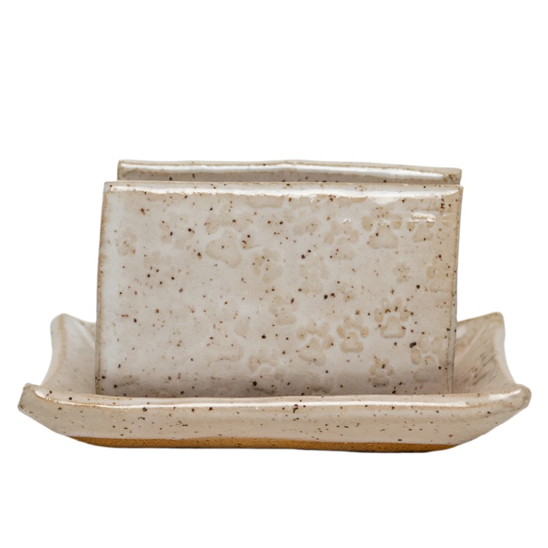 This beautiful stoneware ceramic paw print patterned white sponge holder is hand-built and hand-glazed in Ohio by jack or kim. Food, dishwasher, and microwave safe. It measures approximately 4 inches long by 3 inches wide and 2.5 Inches high. All our ceram