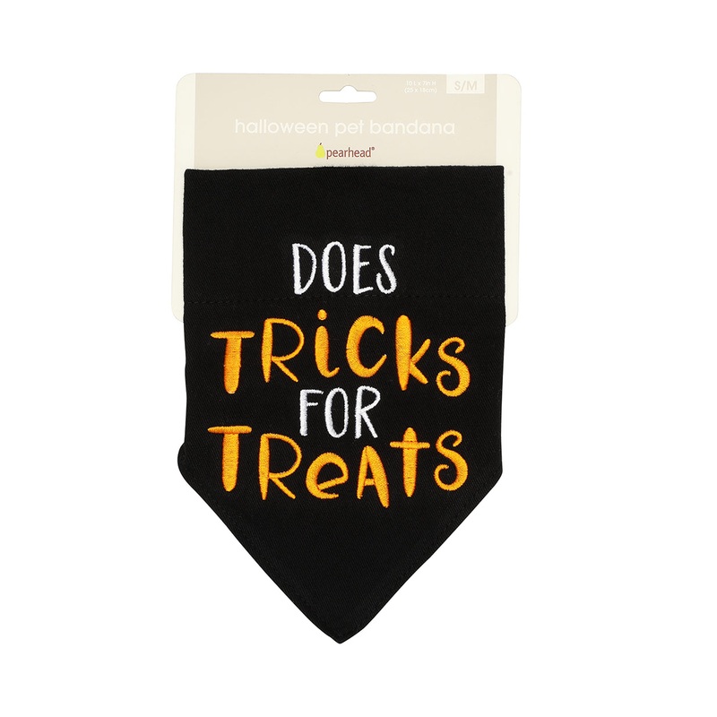 With this festive and fun trick for treat dog bandana by Pearhead your pet will be ready to trick-or-treat and hit any Halloween party! Pet owners will love using this pet apparel as a photo prop, showing off their love for their pup by snapping a photo of their four-legged best friend and creating a pet keepsake picture they can cherish forever.