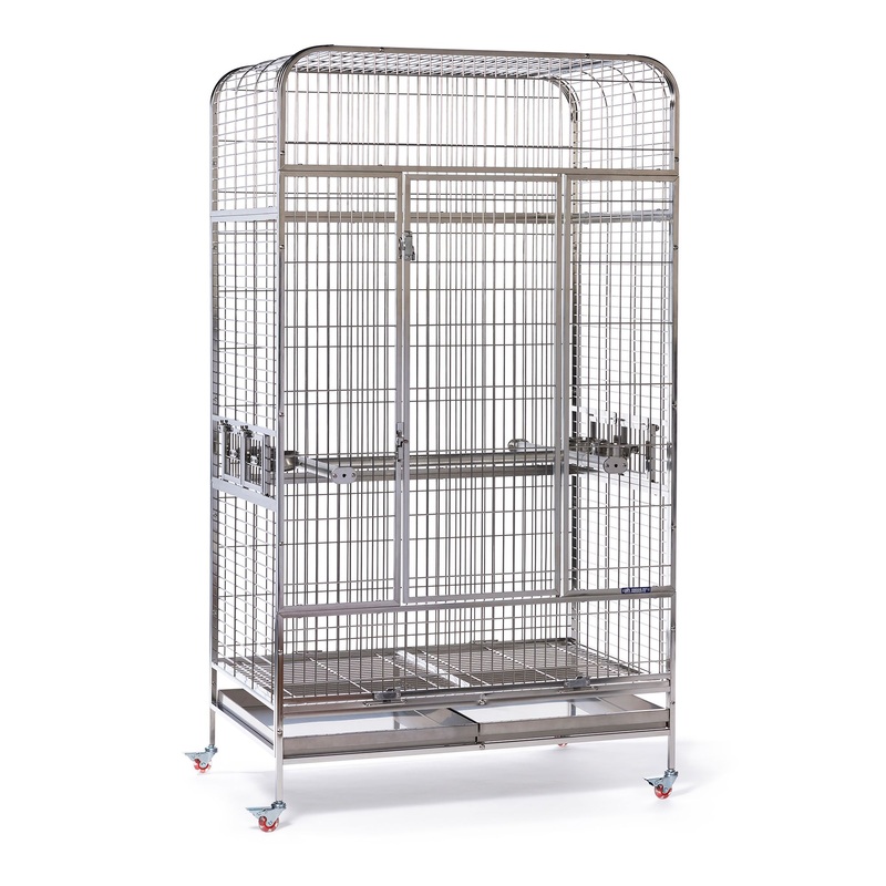 Includes: H-shaped perch, four food/water cups, double pull out grilles, double removable trays, integrated stand with rolling castersIntended Pet(s): African Grey, Amazon, Cockatoo, Severe MacawMaterial(s): Stainless SteelProduct Dimensions: Assembled: 41.25 in L x 27.875 in W x 73.75 in H Product Weight: 120 lb