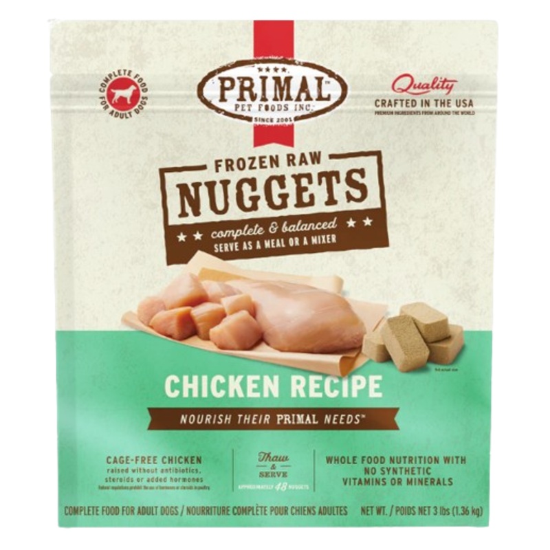 Nourish dogs' primal needs with the complete and balanced, easy-to-use Primal Frozen Raw Nuggets in the Chicken Recipe. This raw dog food offers a convenient and wholesome way to provide canine companions with essential nutrients for peak health and vitali