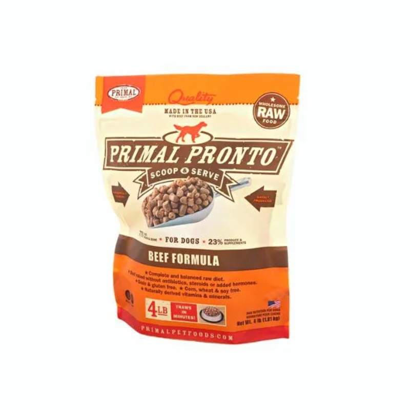 Primal Raw Frozen Pronto for Dogs - Beef Recipe is a delicious raw option for your canine friend. Made from delicious grass-fed beef, this frozen raw food is an excellent source of vitamins, minerals, and essential fatty acids.This product is available in-