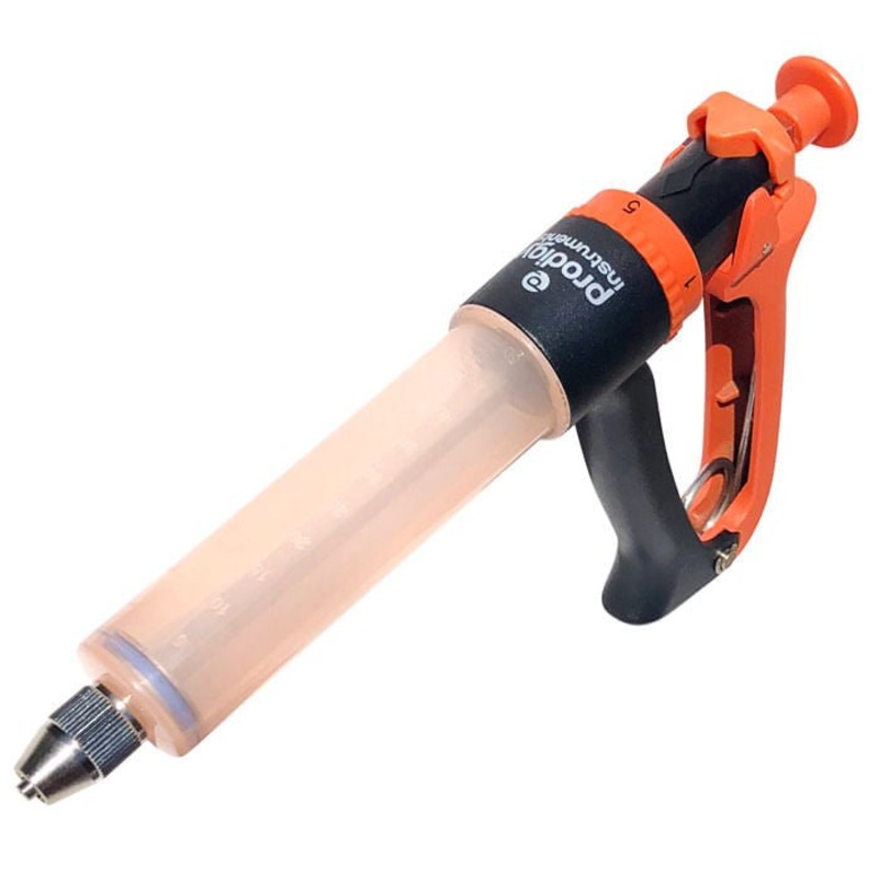 Prodigy Repeater SyringeHigh quality, durable, repeater syringe with unique "click-draw-squeeze" action. Universal, metal Luer lock needle mount. An elastomeric o-ring suited for various medications and oil-based vaccines. The syringe is tinted with a UV r