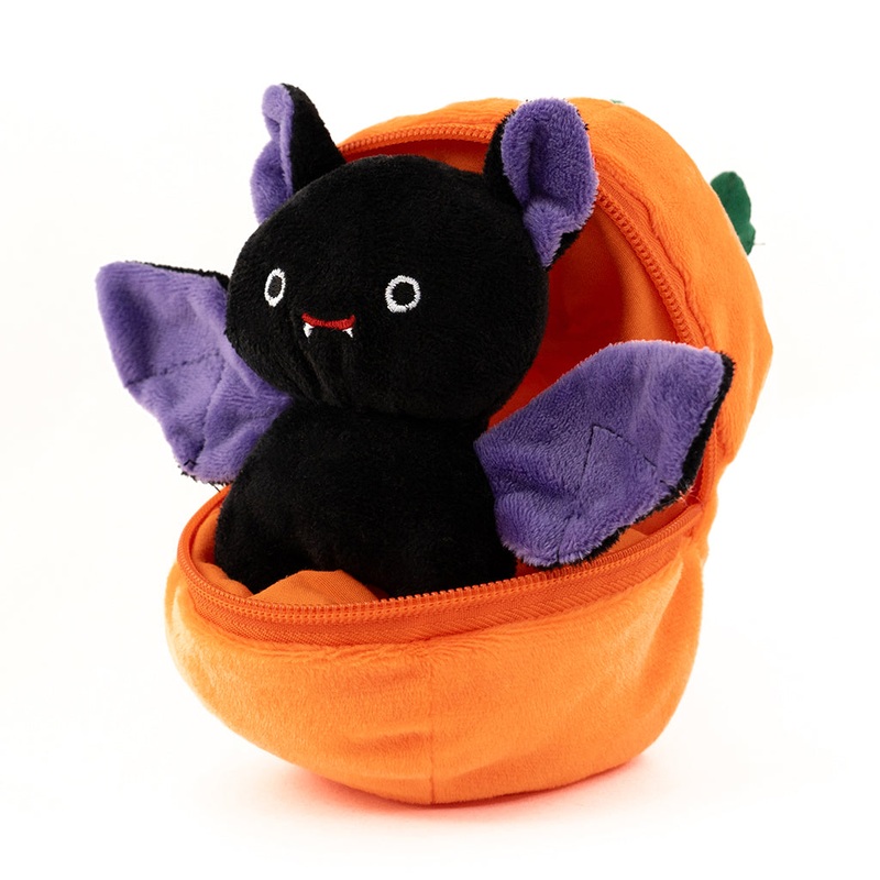 - Zip open this plush pumpkin to reveal a surprisean adorable black bat with purple wings and a friendly vampire smile