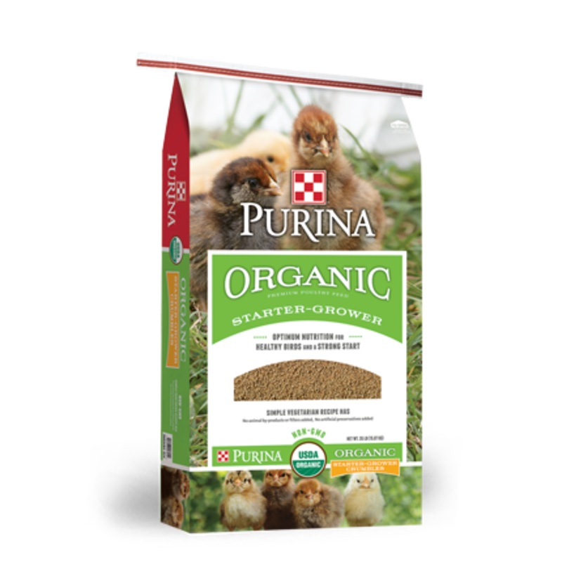 A nutritious, wholesome complete feed for young laying chickens from hatch to laying age (18-20 weeks). This complete feed is certified organic by the USDA and is made with non-GMO ingredients. Purina Organic Starter-Grower feed will provide your birds wit