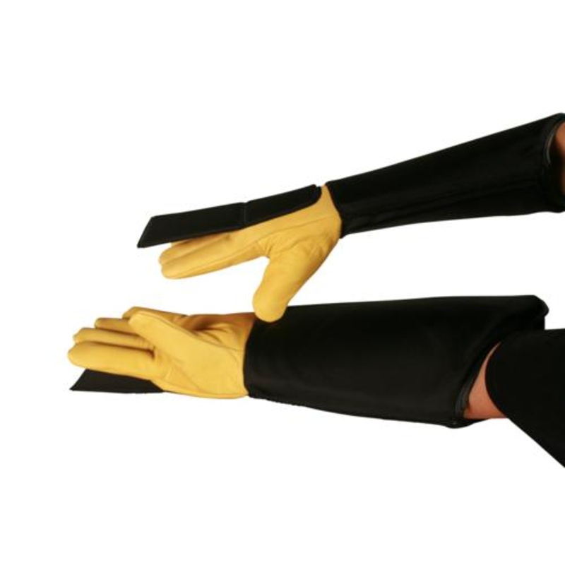 Our Humaniac Rabies Animal Handling Gloves feature an Elkhide hand, lined with DupotKevlar, and then a double-layered leather flap extending over the back of the hand for bite protection. The gauntlets have been heavily padded and extend to the elbow for f
