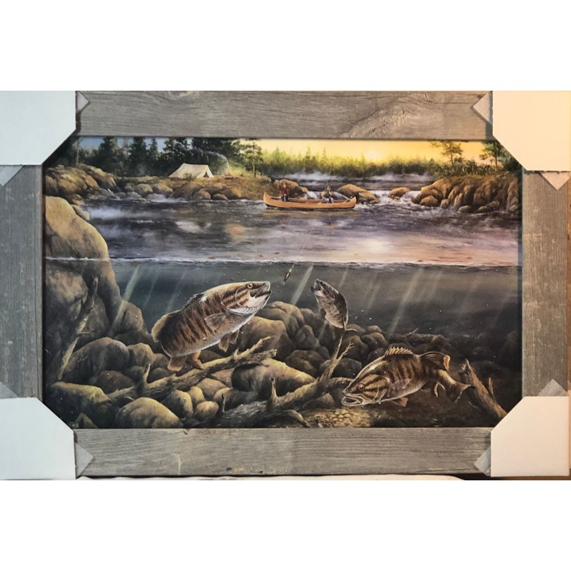 This scene shows a couple of fisherman just outside their camp fishing Walleyes from the looks of things they will be eating a fish dinnerPrint is framed and Hand Textured without glass to give it the look and feel of a canvasFramed Size 25 x 16.5