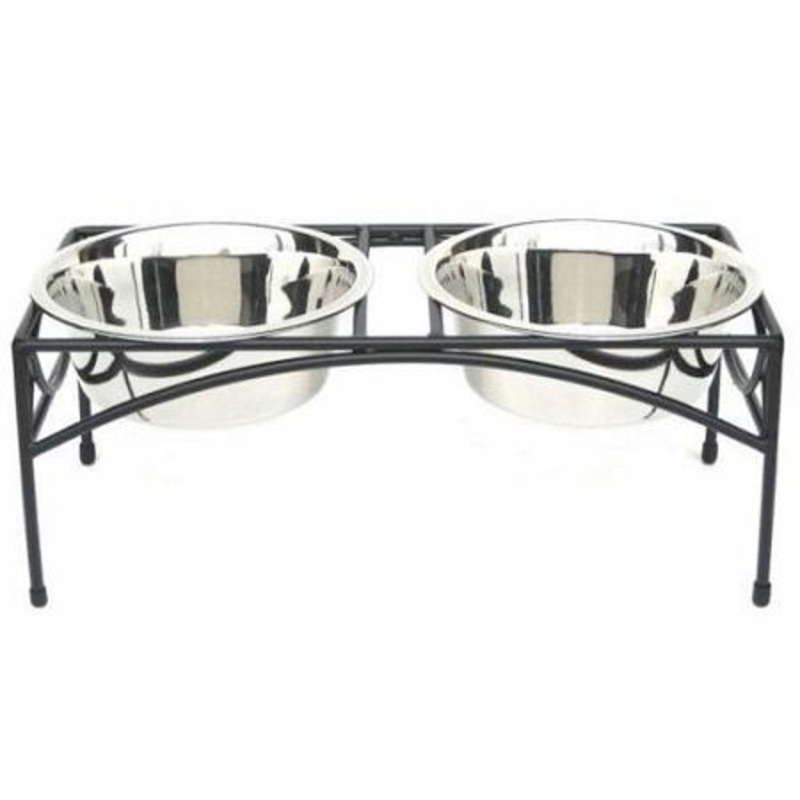 Features:Size: 17.5" L x 8" W x 7" H2 Quart CapacityIncludes durable wrought iron standSturdy ConstructionStainless steel bowlsRounded sides keep food and water centeredLarge bowl opening enable easy refillingDetachable bowls for easy cleaningNo sharp edge