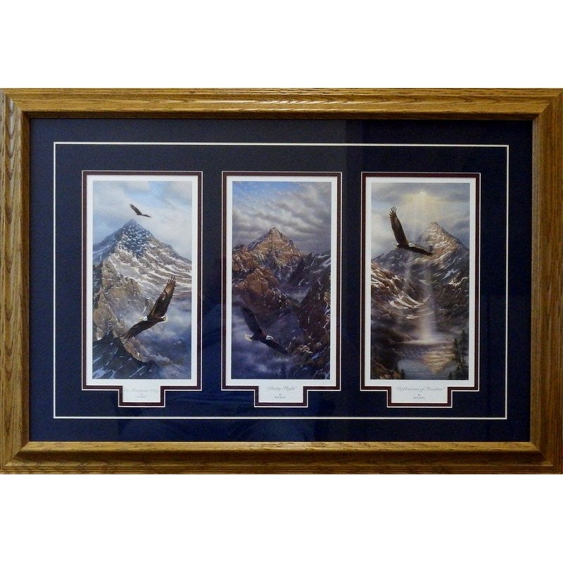 3 Different Prints make up this Kelley Trilogy Each image is 5.25"W x 10.5"HOn Freedoms WingLiberty's FlightReflections of FreedomFramed Size 29 x 21