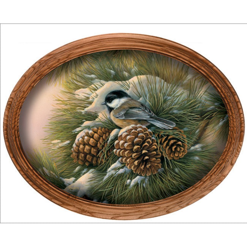 Chickadee in a snow covered pine treeFramed Size 14" x 11"Canvas Style