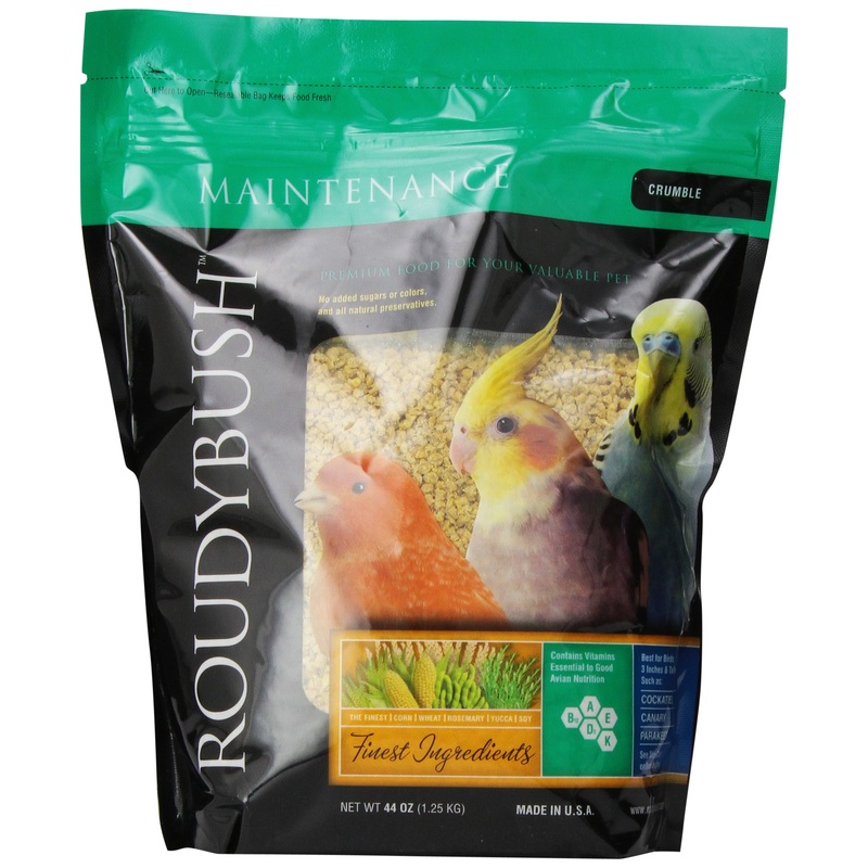 Daily Maintenance, Specially steam-pelleted food designed to retain beneficial nutrients while eliminating harmful bacteria. Give your birds the nutrition they need with no artificial colors or flavors and no animal by-products. Contains 11-Percent protein, 7-Percent fat. Use for pet birds year-round and for off-season breeding birds. No additional vitamins or mineral supplements needed. Please specify Nibbles, Crumbles, Mini Pellets, Small Pellets, Medium Pellets, or Large Pellets.Ideal For Birds 3 Inches And Taller Such As Cockatiels, Quakers, Lovebirds, Budgerigars (Parakeets), Conures, Ringecks, Parrotlets, Canaries And Neophemas. Contains 11-Percent Protein, 7-Percent Fat. Scientifically Formulated. 100-Percent Edible And No Animal By Products. No Added Sugars Or Colors.Best Sellers Rank: See Top 100 in Pet Supplies. Specific Uses for Product: Bird Food. Item Form: Pellet. Target Species: Bird. Age Range Description: All Life Stages. Brand: RoudyBush. International Shipping: This item is not eligible for international shipping. Domestic Shipping: Currently, item can be shipped only within the U.S. and to APO/FPO addresses. For APO/FPO shipments, please check with the manufacturer regarding warranty and support issues. Country of Origin: USA. : B000WFEK0Y. Manufacturer: Roudybush, Inc. Date First Available: August 19, 2004. Item model number: 244CRDM. Product Dimensions: 3 x 10.5 x 9 inches; 2.7 Pounds. Is Discontinued By Manufacturer: No.