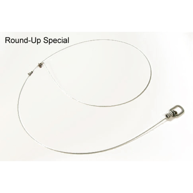 The Roundup Special Snare is constructed of 5' of 7x7 3/32" Galvanized Aircraft Cable with a Micro Lock, and a Universal support collar. It is equipped with a #9 Swivel and has a universal support collar. For coyote, fox, raccoon, badger, and beaver. This