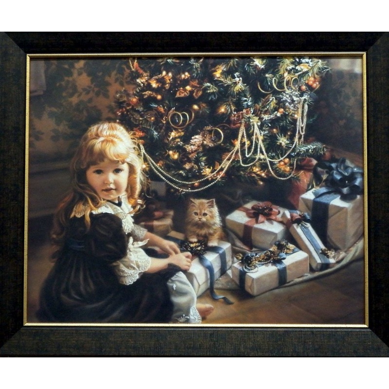 Little Girl under the Christmas Tree with her kitten Christmas DayPrint is framed and hand textured without glass to give it the look and feel of a canvasFramed size 24"W x 19.75"H