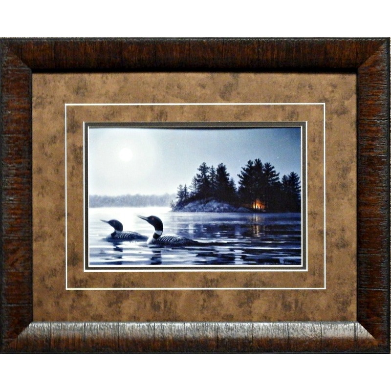 Two Loons are quietly swimming across the moonlit lakeFramed Size 21"W x 17"H